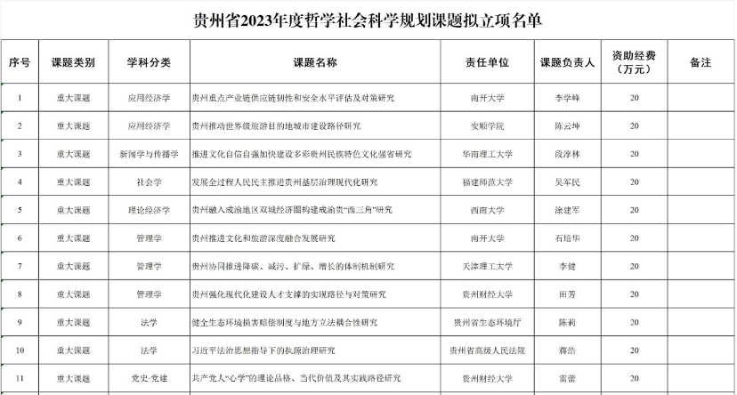 (通讯员 侯晓飞)近日,贵州省哲学社会科学规划办公室正式公布了“贵州省2023年度哲学社会科学规划课题拟立项名单”。公司教授、英国365集团网站现代旅游业发展省部共建协同创新中心主任、中国式现代化发展研究院高级研究员石培华牵头申报的“贵州推进文化和旅游深度融合发展研究”课题获批重大项目,资助经费为20万元,本次立项名单中共有11项获重大课题立项。