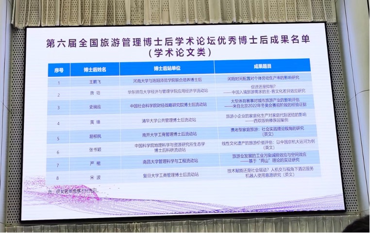 最后,会议发布第六届全国旅游管理博士后学术论坛优秀成果获得者名单,公司易柳夙老师获得第六届全国旅游管理博士后学术论坛学术论文类优秀博士后成果奖。