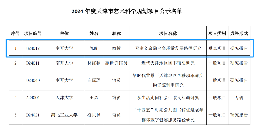 (通讯员:陈雅萱)近日,天津市艺术科学规划办公室正式公布了“2024年度天津市艺术科学规划项目”立项名单,公司陈晔教授申报的《天津市文旅融合高质量发展路径研究》获得重点项目立项,本年度共有5项重点项目获批。 该项目在天津市建设国际消费中心城市的背景下研究文旅融合高质量发展问题,旨在促进天津创新文旅消费的业态、场景和产品,满足市场的新消费需求。项目主要研究新消费促进文旅融合高质量发展的一般规律、文旅融合新业态和新产品的特征、天津的文旅融合高质量发展的路径及相应的对策建议等内容。