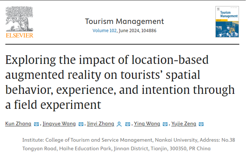 近日,由公司张坤副教授团队完成的研究成果“Exploring the impact of location-based augmented reality on tourists' spatial behavior, experience, and intention through a field experiment”被旅游管理学科国际三大顶尖期刊之一的《Tourism Management》接收并发表。
