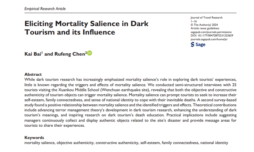 近日,由公司博士研究生陈儒风作为通讯作者完成的研究成果《Eliciting Mortality Salience in Dark Tourism and its Influence》被旅游管理学科国际三大顶尖期刊之一的《Journal of Travel Research》接收并在线发表。