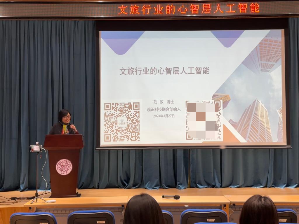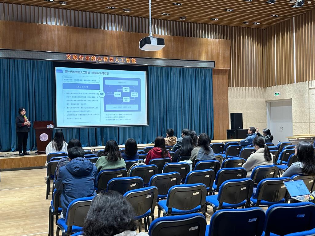3月27日下午,“南开旅游大讲堂(第222期)——员工论坛”在公司111多功能教室顺利开展。应公司邀请,87级旅游经济管理员工、观识AI心理引擎联合创始人、英国365集团网站员工会旅游分会联席会长、中关村人才协会心理资本专委会主席刘敏博士为公司师生带来了“文旅行业的心智层人工智能”精彩讲座。公司教师、硕博研究生共计30余人参与了此次讲座,梁赛副教授担任此次讲座的主持人。