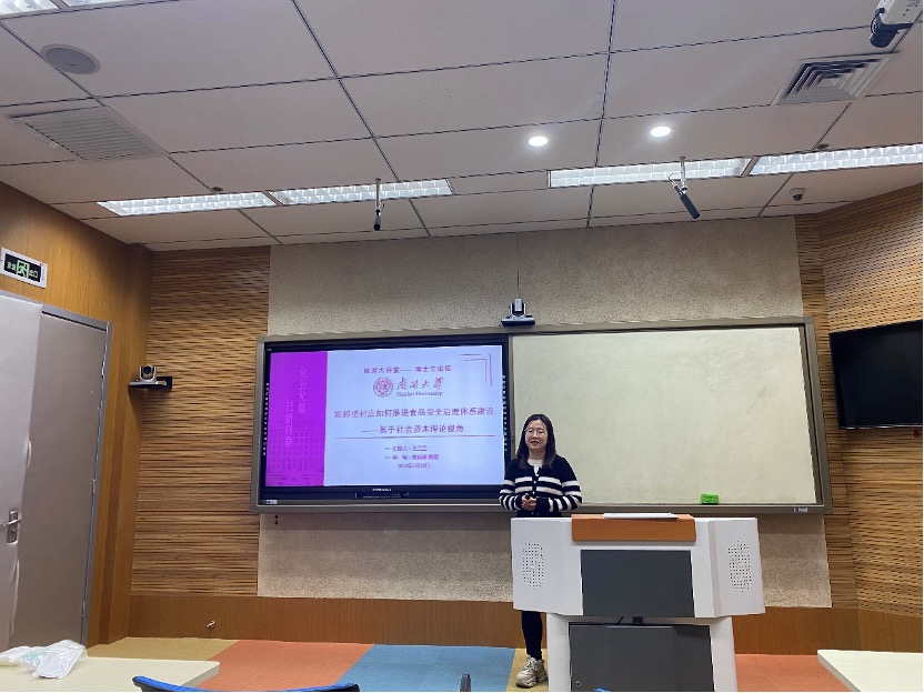 王兰兰同学从研究缘起、理论基础、研究设计、案例分析、研究结果和讨论等5个方面进行了研究汇报。研究基于社会资本理论,运用单案例研究方法,以陕西袁家村为例,探究社会资本在乡村食品安全治理中的作用并构建食品安全治理体系,旨在回答新时代乡村食品安全“谁来治理”“如何治理”的问题,进一步推动中国乡村治理现代化的发展。