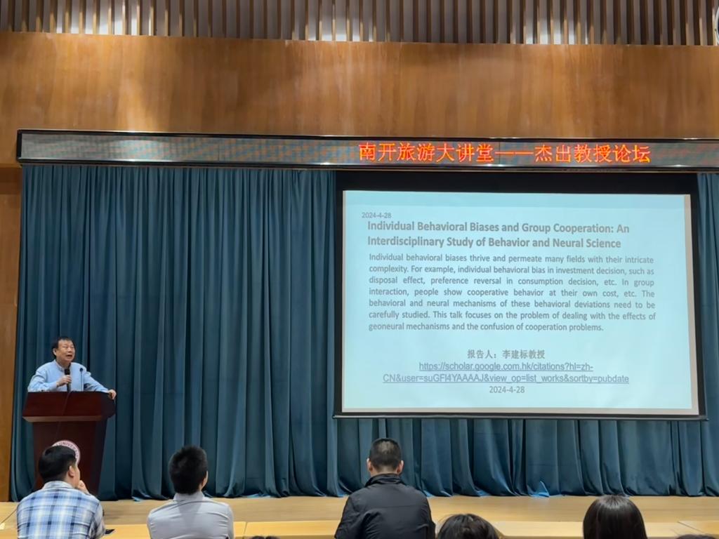 4月29日上午,“南开旅游大讲堂(第229期)——杰出教授论坛”在公司111教室顺利开展。应公司邀请,山东大学类脑经济学研究中心主任、山东大学特聘教授、国家社科基金重大项目首席专家、全国实验经济学与博弈论研究会副理事长李建标为公司师生带来了“Individual Behavioral Biases and Group Cooperation: An Interdisciplinary Study of Behavior and Neural Science”精彩座谈。公司教师、硕博研究生共计50余人参与了此次讲座,李晓义副教授担任此次讲座的主持人。