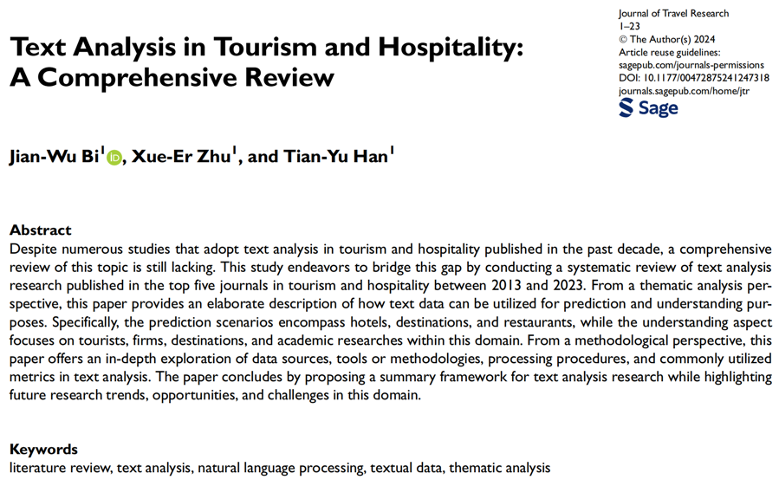 近日,由公司毕建武副教授、硕士生朱雪儿以及博士生韩添羽共同完成的研究成果《Text Analysis in Tourism and Hospitality: A Comprehensive Review》被旅游管理学科国际顶尖期刊之一的《Journal of Travel Research》接收并发表。