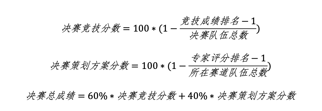 实践策划方案由评委团队评分;决赛的实验竞技和实践策划方案均按照成绩排名由高到低计分,决赛名次由决赛总分数由高到底排序确定,分数计算方式如下: