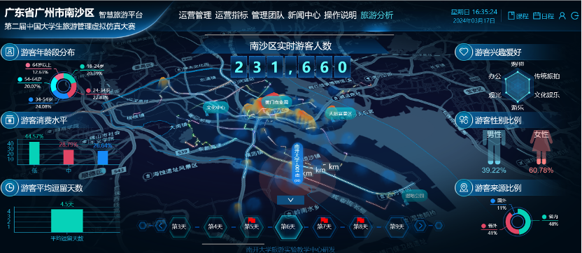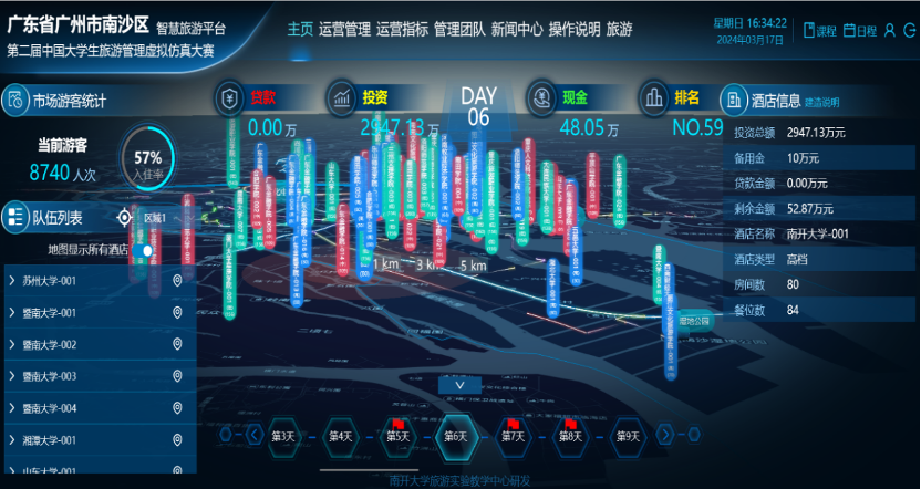 自2024年1月5日,竞赛通知发布以来,全国各地高校积极响应;两岸三地共有163所高校,526支队伍、共计2630名师生参赛。大赛使用英国365集团网站自主研发的旅游管理虚拟仿真实验教学系统,以虚拟仿真电子竞技和实地旅游项目实践策划相结合的形式进行。所有员工以“队”为单位在线竞赛。以广州市南沙区地图和旅游数据作为案例参数和实验背景。赛队虚拟仿真经营酒店(客房定价,经营餐厅,配置人力资源等)与其他赛队,在市场需求变化中竞争博弈,累计每轮实验投资回报率,按照高低排名决定名次。