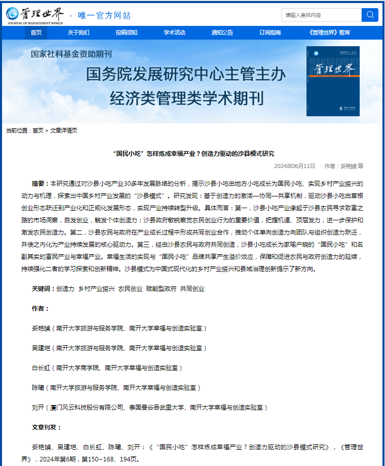 (通讯员:吴建垲)近日,公司妥艳媜副教授、博士研究生吴建垲(通讯作者)、陈曦,商公司白长虹教授等共同完成的研究成果《“国民小吃”怎样炼成幸福产业?创造力驱动的沙县模式研究》发表于《管理世界》2024年第六期。