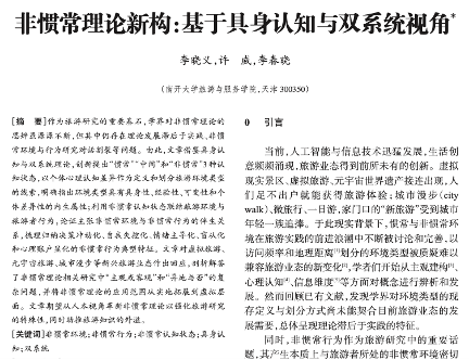 近日,由公司硕士研究生许威完成,李晓义副教授和李春晓教授共同指导,发表于《旅游学刊》的论文《非惯常理论新构:基于具身认知与双系统视角》获中国人民大学复印报刊资料《旅游管理》2024年第6期全文转载。