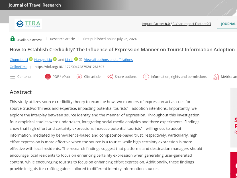 近日,由公司李春晓教授、博士生刘红旭以及博士生李琳共同完成的研究成果《How to Establish Credibility? The Influence of Expression Manner on Tourist Information Adoption》被旅游管理学科国际顶尖期刊之一的《Journal of Travel Research》接收并发表。