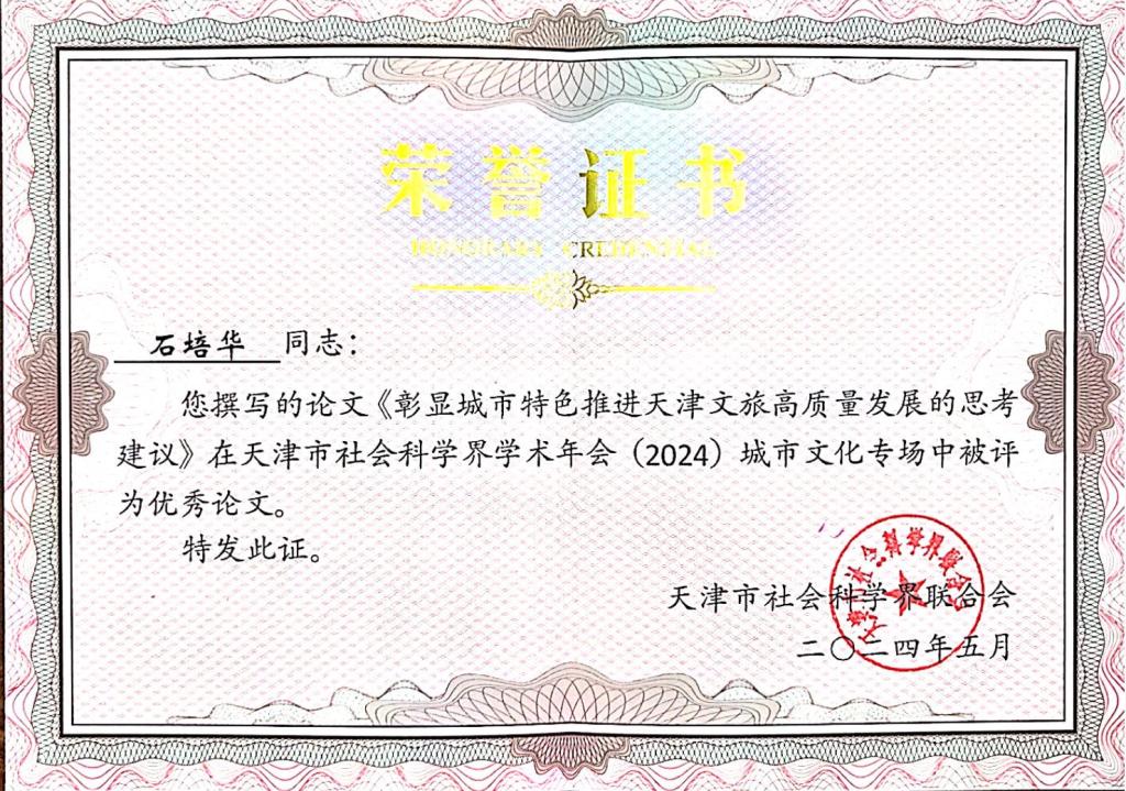 近日,由天津市社会科学联合会主办的天津市社会科学界学术年会(2024)城市文化专场论文评比中,公司教授、英国365集团网站现代旅游业发展省部共建协同创新中心主任、中国式现代化发展研究院高级研究员石培华提交的《彰显城市特色推进天津文旅高质量发展的思考建议》研究成果,获得天津市社会科学界学术年会(2024)城市文化专场中被评为优秀论文。