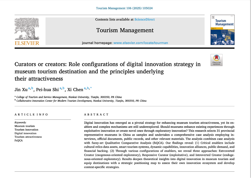 近日,由公司教授、英国365集团网站现代旅游业发展省部共建协同创新中心主任石培华指导,博士研究生徐进和陈曦合作完成的研究成果“策展人还是创造者:博物馆旅游目的地数字创新的角色配置及其吸引力法则”(Curators or creators: Role configurations of digital innovation strategy in museum tourism destination and the principles underlying their attractiveness)被旅游管理三大国际顶尖期刊之一的《Tourism Management》正式录用刊登。