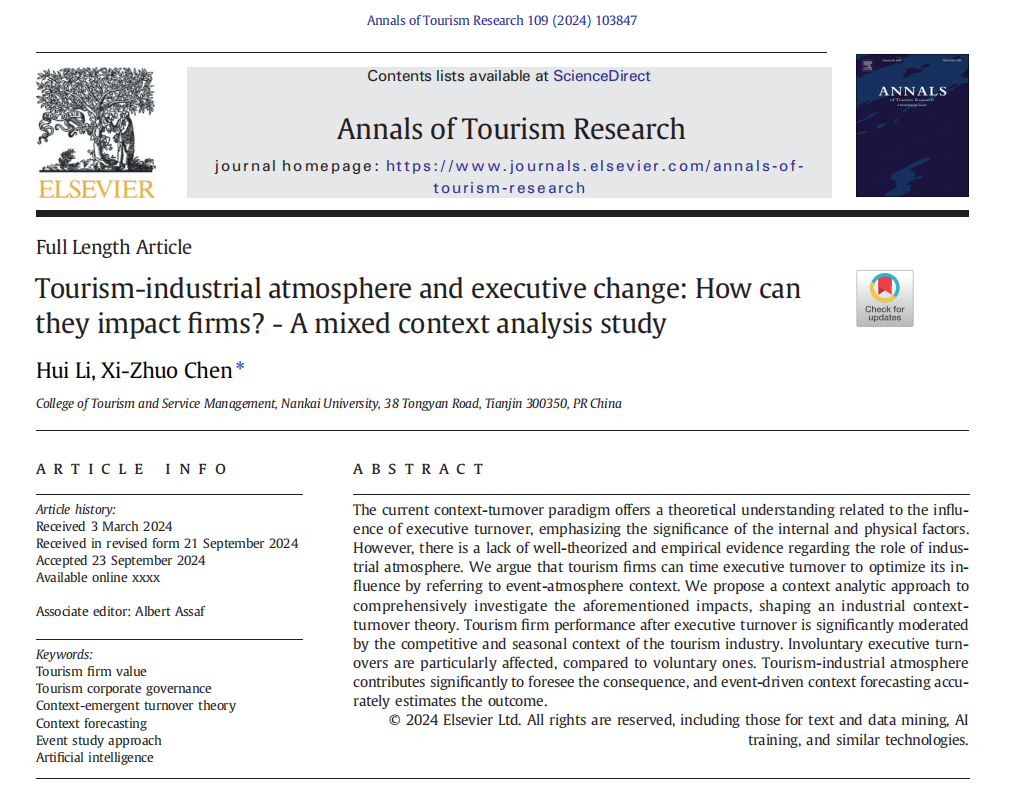 (通讯员 陈希卓)近日,由公司李辉教授、博士研究生陈希卓共同完成的研究成果《Tourism-industrial atmosphere and executive change: How can they impact firms? - A mixed context analysis study》被旅游管理学科国际三大顶尖期刊之一的《Annals of Tourism Research》接收并发表。