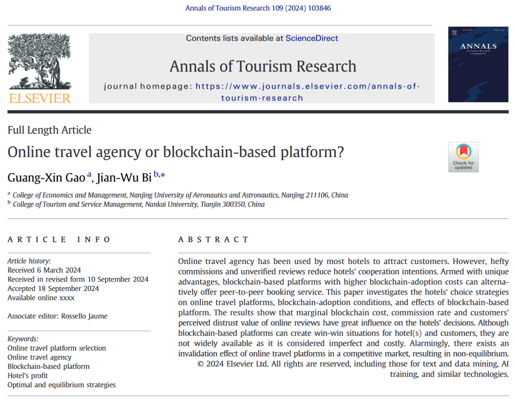 (通讯员 位子涵)近日,公司毕建武副教授作为通讯作者与南京航空航天大学高广鑫副教授合作完成的研究成果《Online travel agency or blockchain-based platform?》被旅游管理学科国际三大顶尖期刊之一的《Annals of Tourism Research》接收并发表。