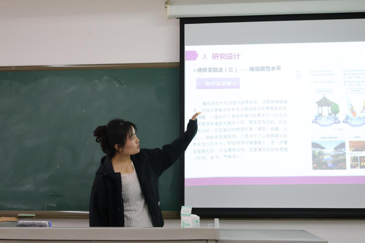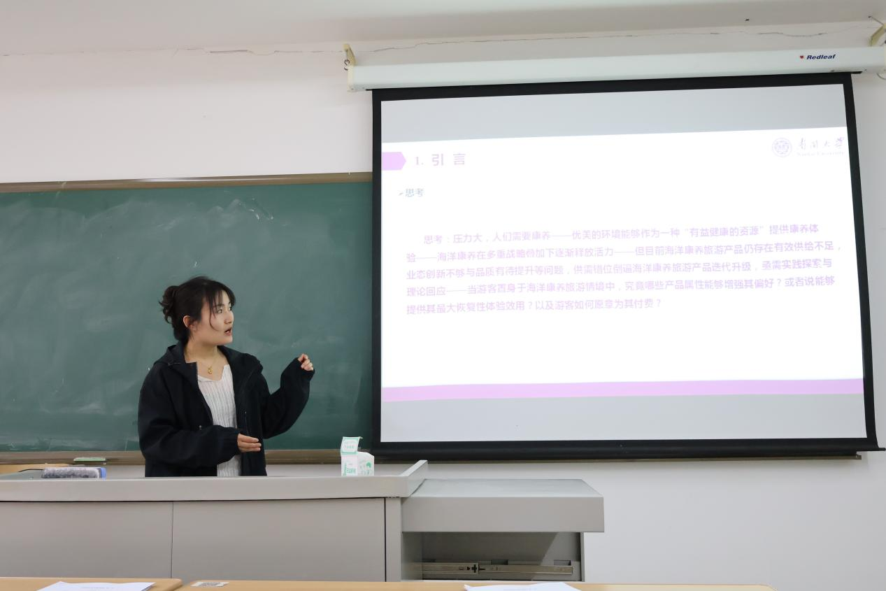 李静同学从研究背景、文献综述、研究方法、研究发现、结论与讨论五个方面进行了研究汇报。该研究以中国旅游集团港中旅(青岛)海泉湾度假区为案例地,采用选择实验法,依托恢复性环境感知理论,识别游客需求视角下海洋康养旅游产品的疗愈体验属性,并据此创新设计海洋康养旅游产品,进而实证测度游客对海洋康养旅游产品的选择偏好。研究发现:心理距离、海洋温泉魅力、感官具身联觉、服务媒介联通与满足心理健康需求是海洋康养旅游产品疗愈体验属性的主要维度,这些属性水平的提升能够显著增强游客选择偏好;游客市场可细分为心灵逃逸型、自然联结型、主题沉浸型与身心修复型四类群体,其中心灵逃逸型偏好产品的心理距离属性,自然联结型青睐产品的感官具身联觉属性,主题沉浸型热衷产品的海洋温泉魅力属性,而身心修复型则注重产品满足心理及身体健康的属性。研究为旅游企业精准定位目标市场、合理制定价格策略与迭代创新产品设计等战略决策部署提供了理论依据。