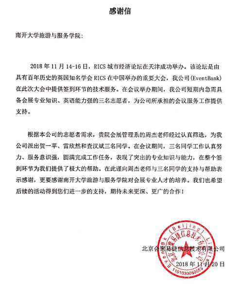 在会议召开期间,公司2016级会展经济与管理专业的贺一苹和雷欣然以及2016级旅游管理专业的查汉斌三名同学认真高效的完成了相关会议服务工作,北京会聚易捷信息技术有限公司(EventBank)对三名同学的工作态度与专业能力高度认可,并特向公司发来感谢信。