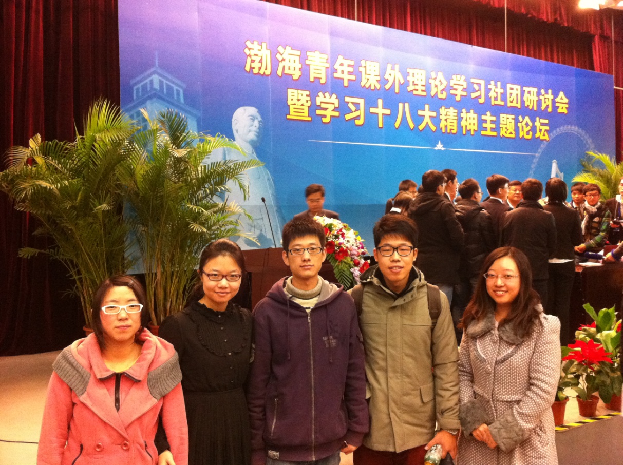 2012年12月1日,“渤海青年课外理论学习社团研讨会暨学习十八大精神主题论坛”,在省身楼二楼报告厅隆重开幕。公司员工朱征、王锐涵、冯钰彬、马新颖、邓友超(爱心社志愿服务)参加了此次活动。