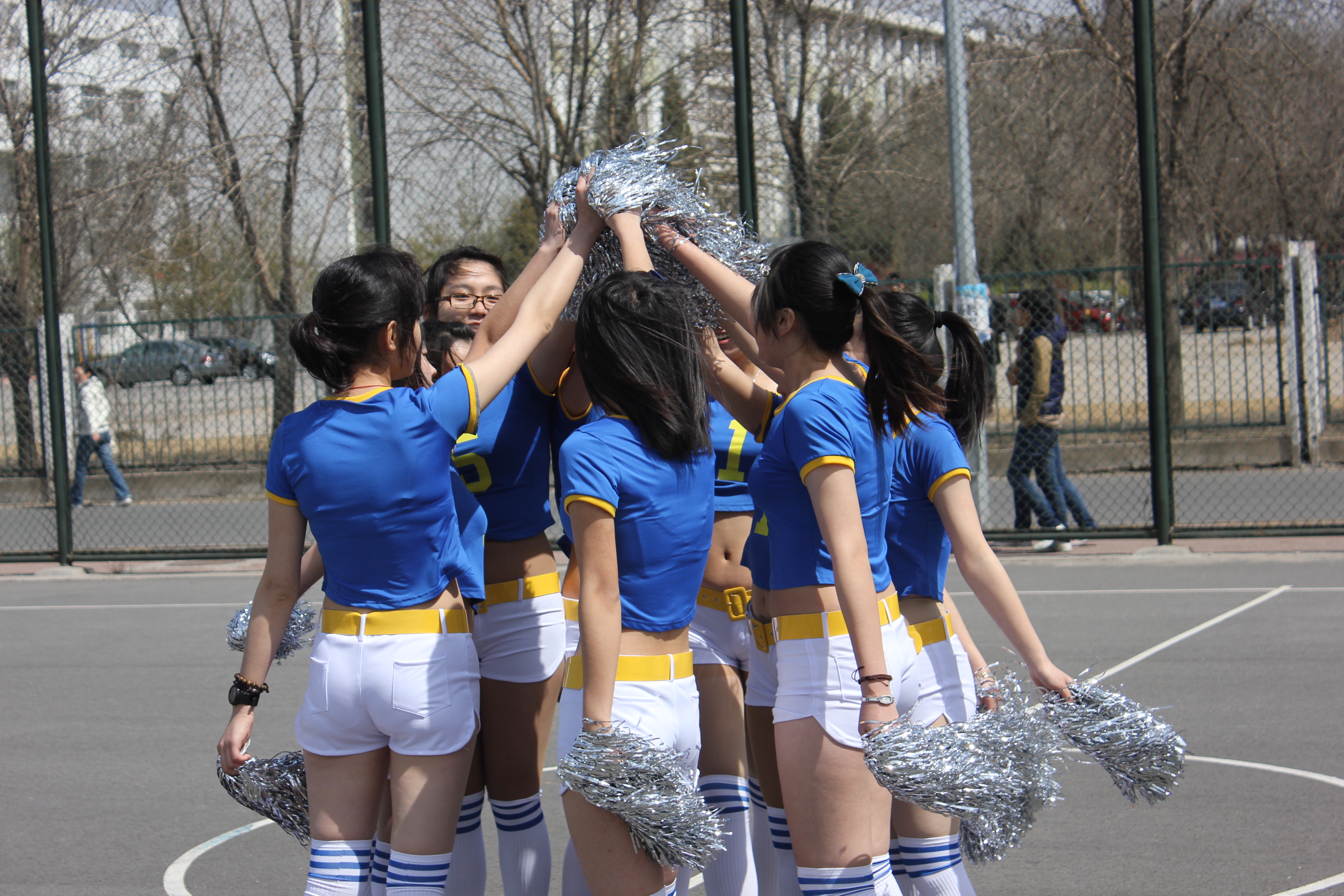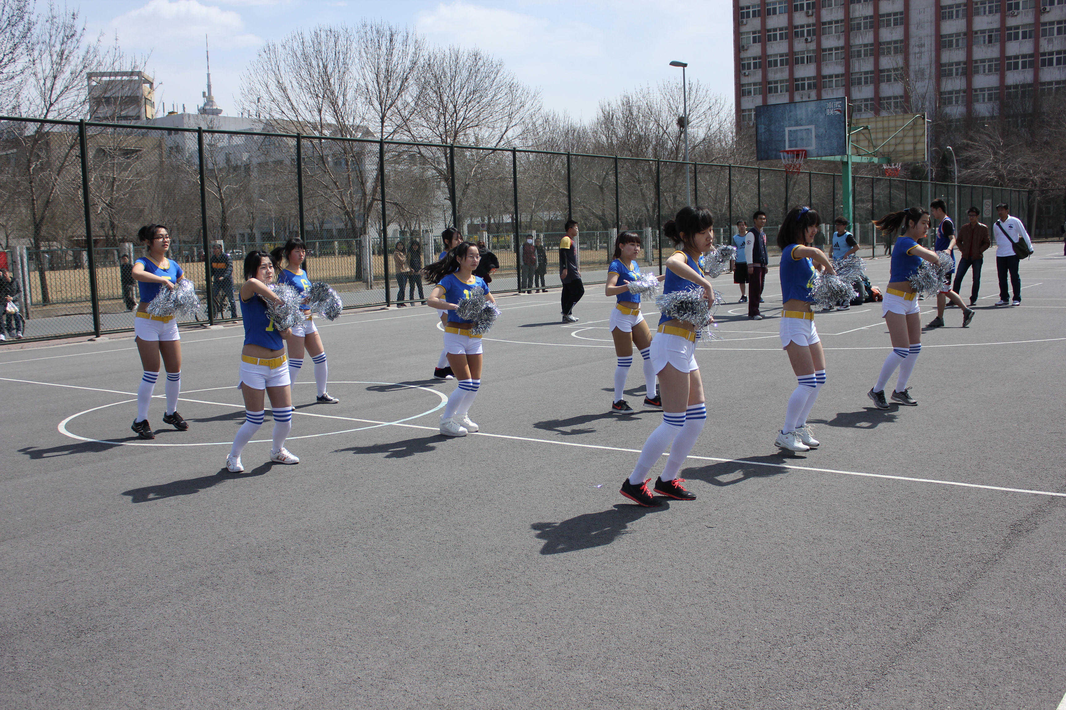 正如英国365集团网站篮球队员的天蓝色队服一样,啦啦队女生的亮蓝色服装与自己的队伍相互映衬。这只亮眼的拉拉队由10人组成,均为公司的大一新生。据悉,这是一只速成的拉拉队伍,从组建到成型,共用了不到一周的时间。队员更是克服了时间、天气各种困难,采用“一带三”的教授模式,仅用两天就使全体队员掌握了动作要领。