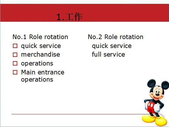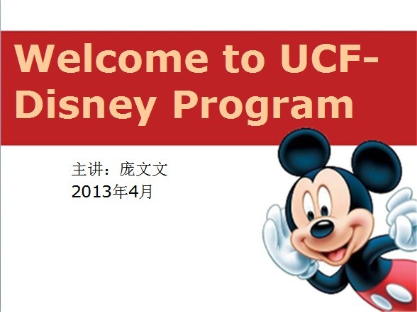 学姐细致地介绍了UCF-DISNEY项目的工作项目,和期中的轮班制度,力求让我们知道的更为全面,有更多的选择。同时也简略的介绍了一下工作地点DISNEY的构造、节目、住宿等信息,并且都认真地配以图片来说明介绍,给我们以更为直观的了解。