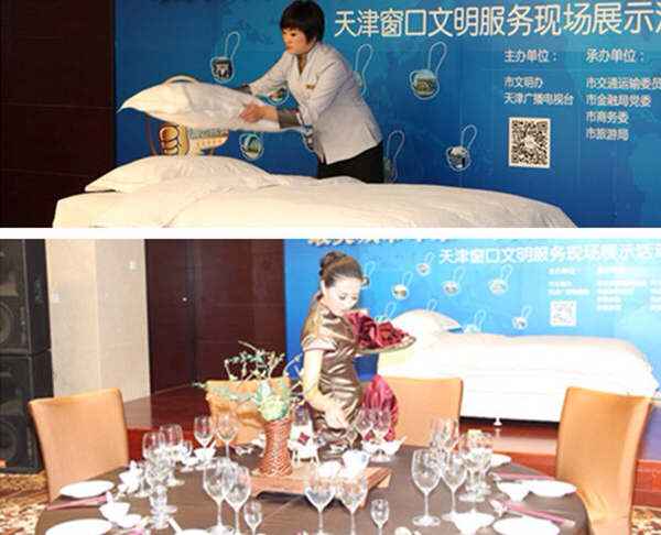 在窗口文明服务现场展示活动中,铁路、客运、机场、港口、公交、出租、地铁、旅游、商业、金融、卫生和通信等12个行业通过多种形式展示服务风采。其中,金丽华酒店职工代表旅游行业进行现场展示。客房的床上用品和餐桌上的餐具在她们的手中像是有了魔力一般,被又快又好地整理摆放得井然有序,俨然一件件艺术品,赢得在场观众评审的阵阵掌声。