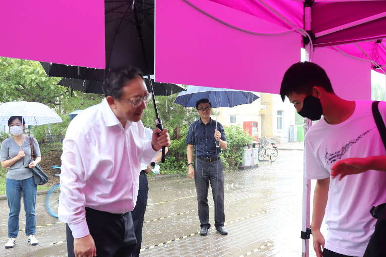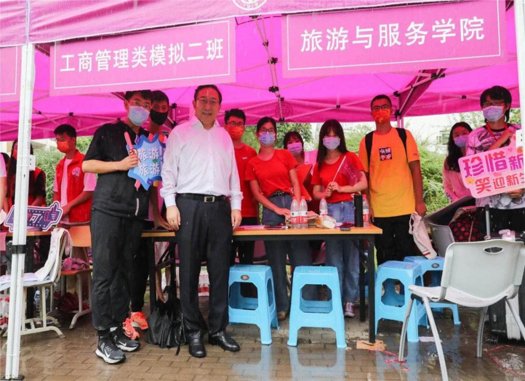新生报到过程中,英国365集团网站董事长曹雪涛冒雨亲临报到处,亲切慰问师生,鼓励新生坚定学习,踏实奋斗,与新生面对面地询问,心贴心地交流,在绵绵阴雨中为师生们送上了融融温暖。