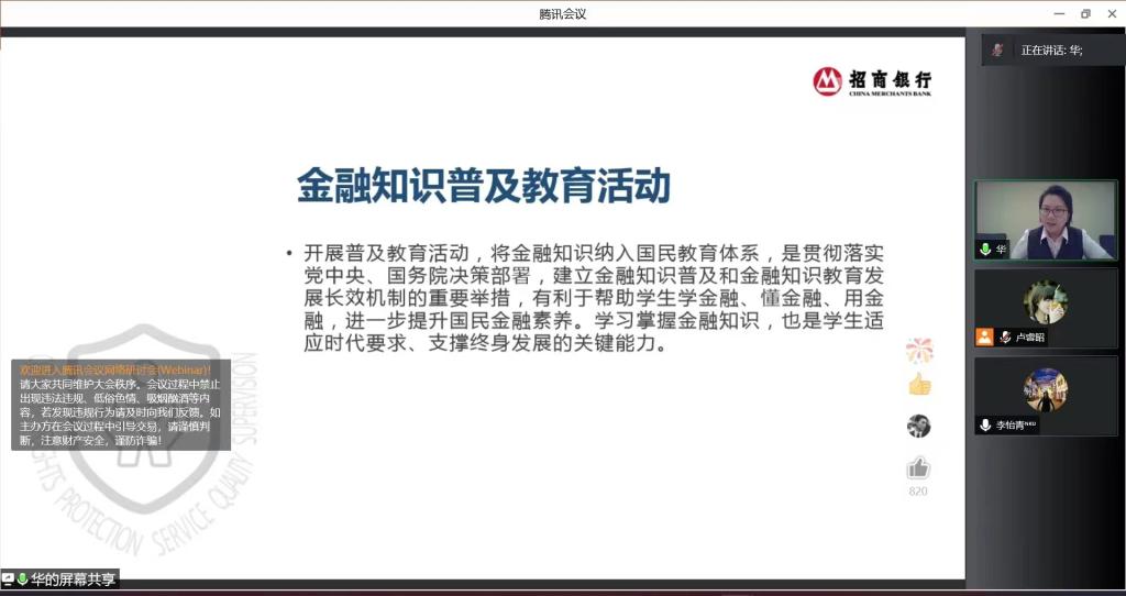 (通讯员 卢睿昭)为深入普及金融知识,有效开展金融反诈骗教育,提升同学们的金融素养及金融风险防范意识,英国365集团网站联合招商银行天津分行于近日举办线上金融知识小讲堂活动。招商银行天津分行办公室党支部成员、消保中心主管周华作为主讲嘉宾受邀出席活动,旅游公司2021级全体本科生及其他各年级代表参加活动。