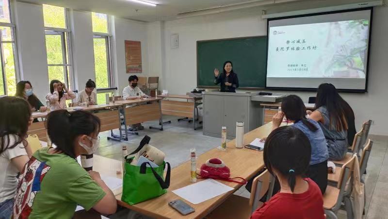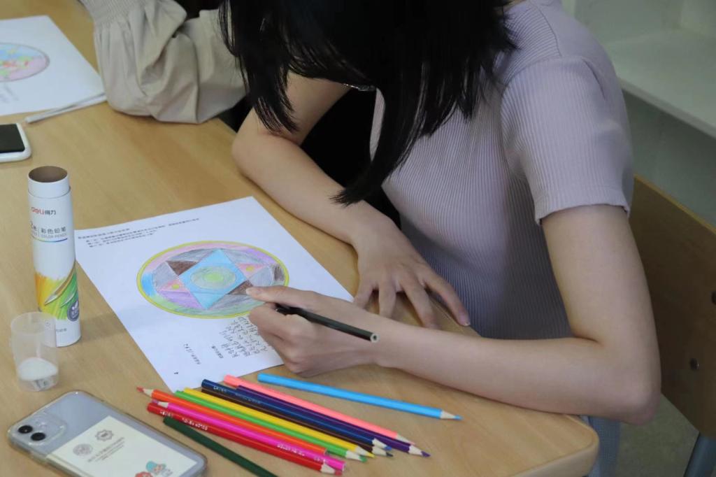 活动伊始,朱红详细介绍了曼陀罗作为传统艺术形式的基本概念和曼陀罗绘画在心理治疗方面的应用与功能。随后,朱红为同学们讲解绘画的注意事项,引导同学们遵循自己内心的秩序或脑海中出现的意象,在安静祥和的氛围中绘画曼陀罗图案。最后,朱红与大家亲切互动,交流绘画过程中的心理感受,帮助同学们舒缓压力。