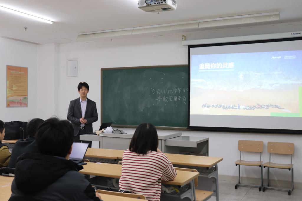 会议伊始,朱程详细了解同学们的未来发展规划和实习就业想法。随后他通过几个视频介绍了万豪集团的发展历史、总体规模、运营情况和经营理念,并围绕时间周期、课程安排以及培训内容等方面详细介绍了万豪集团管培生项目,鼓励同学们依据自身的能力和优势去选择合适的岗位。接着,朱程着重介绍了管培生项目的报名以及面试流程。