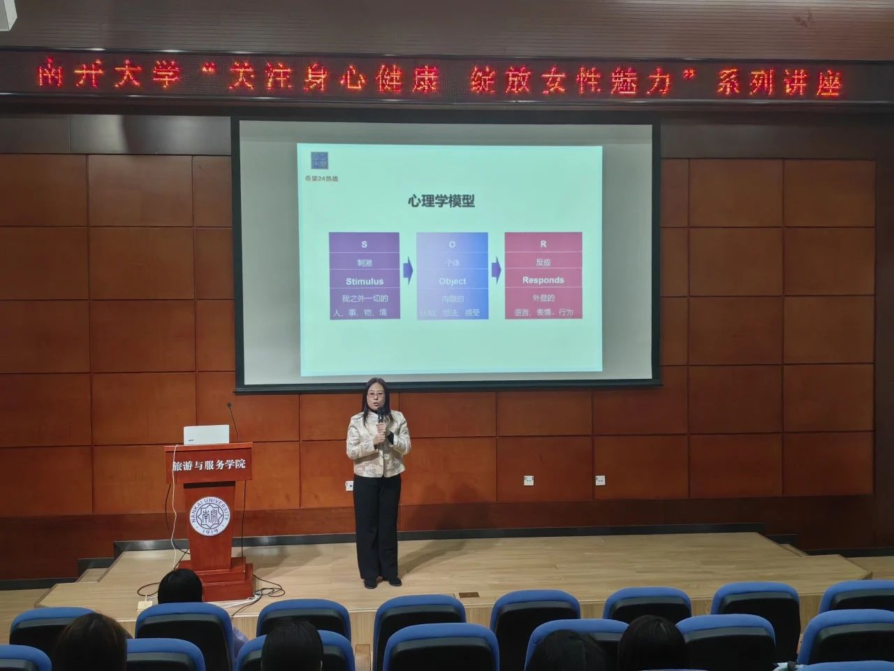 接下来的讲座中,李政老师以深入浅出的方式讲解了丰富的心理健康知识。她从心理学SOR模型的角度讲解如何剖析自我的状态,告诉大家要建立起“不论遇到什么样的外界干扰,个体的反应都是由‘我’而决定”的意识概念,鼓励大家勇敢面对困难,积极寻求解决方法。此外,她还为在场女性科普了常用的妇科知识,讲解生动有趣,内容干货十足。在场师生纷纷表示受益匪浅,并表示会将所学知识运用到日常生活中,关爱自己的身心健康。
