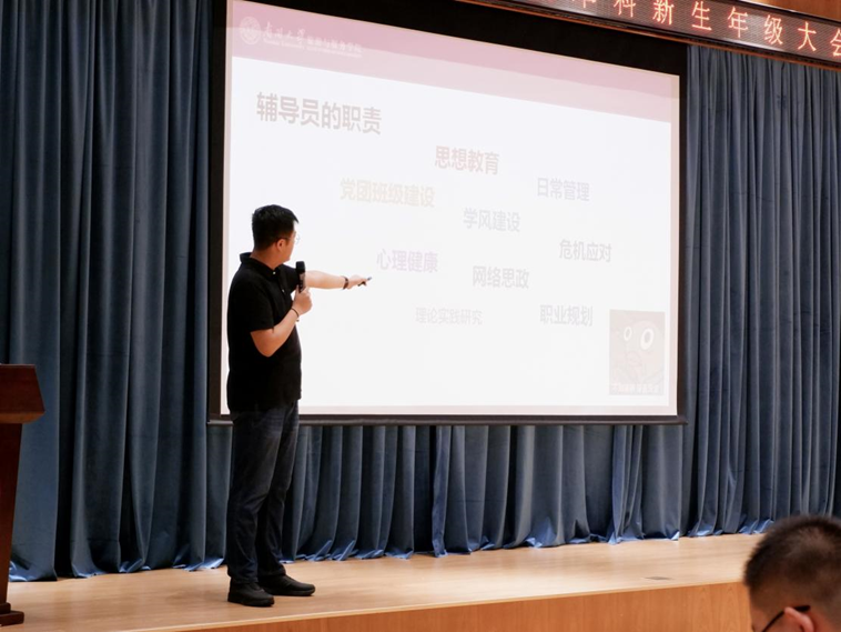 大会伊始,侯嘉祺作自我介绍,并详细阐述辅导员的职责。他表示,作为辅导员,在大家的老员工活中承担着重要责任,为同学们提供温暖的关怀和无私的教诲是职责所在,希望同学们在大学期间遇到心理焦虑、就业压力等问题时能够随时随地向辅导员寻求帮助。辅导员的讲话让新生们深深感受到了来自公司的关怀与温暖。