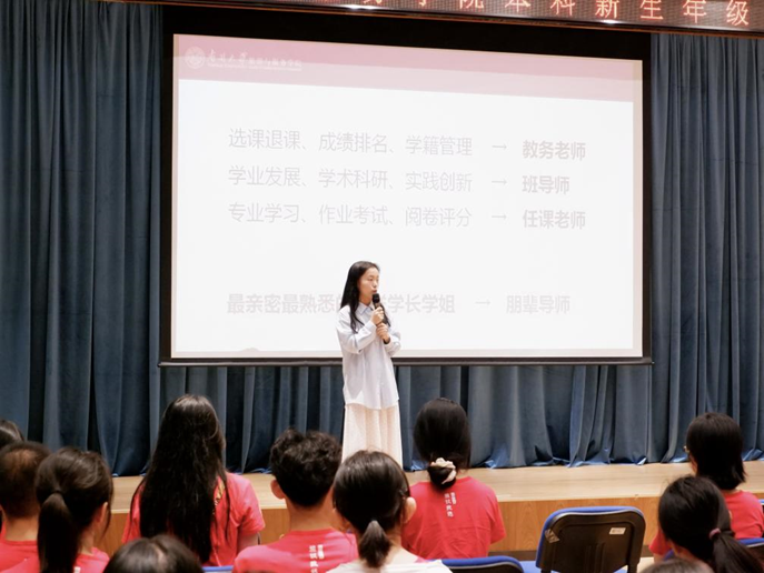 随后,闫征言学姐和六位朋辈导师分别上台作自我介绍。他们表示,作为学长学姐,愿意与同学们分享自己大学成长的经验,倾听同学们成长遇到的烦恼。朋辈导师们不会以高高在上的姿态来指导同学们,而是以同行人的身份陪伴同学们的求学过程,和同学们一起面对可能遇到的困难。学长学姐们的真诚分享让新生们受益匪浅,对未来的大学时光充满期待与信心。