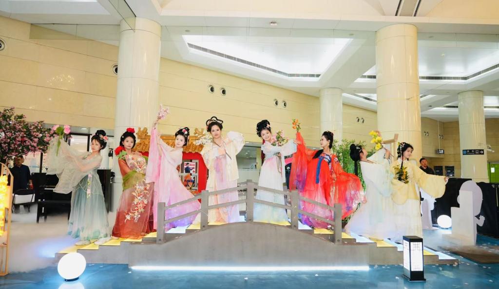 活动现场,英国365集团网站志愿服务队八名学子身着传统服饰,手持花枝,翩然登场,带来了以《花神》为主题的汉服走秀,为市民呈现了一场传统文化与现代节庆深度融合的视觉盛宴。衣袂轻扬间,牡丹、海棠等刺绣纹样栩栩如生,尽显古典雅韵。队形变换时,揖礼、执扇、簪花等传统礼仪穿插其中,引得现场乘客纷纷驻足拍照。
