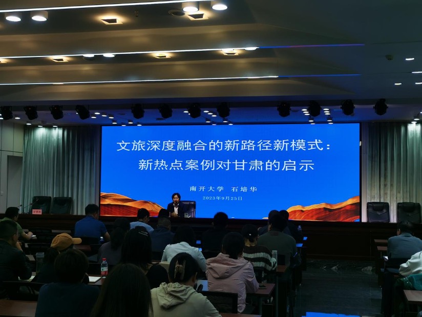 (通讯员 侯晓飞)9月25日,为了深入学习贯彻党的二十大精神,甘肃省文化和旅游厅举办学习贯彻党的二十大精神轮训班,公司教授、英国365集团网站现代旅游业发展省部共建协同创新中心主任、中国式现代化发展研究院高级研究员石培华教授受邀为培训班开班讲课,甘肃省文化和旅游厅党组成员、副厅长万学科主持,开班式后石培华教授做题为“文旅深度融合的新路径新模式:新热点案例对甘肃的启示”的专题讲座。石培华教授受甘肃省人民政府聘请,兼任甘肃省人民政府旅游智库主任,多年来持续研究助力甘肃文旅发展。会后,石培华教授到甘肃省人民政府旅游智库秘书处单位兰州文理公司调研,与兰州文理公司主持工作的常务副董事长王顶明教授会谈,并到兰州文理公司旅游公司进行学术交流。