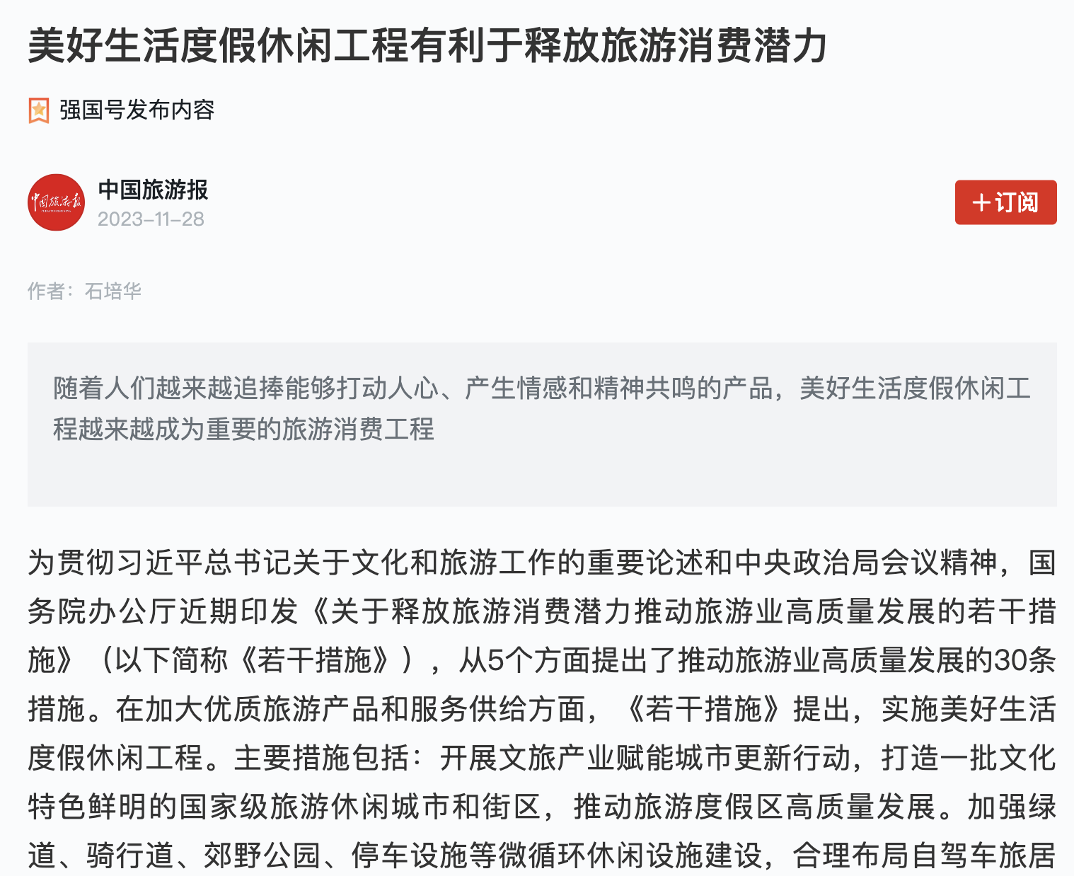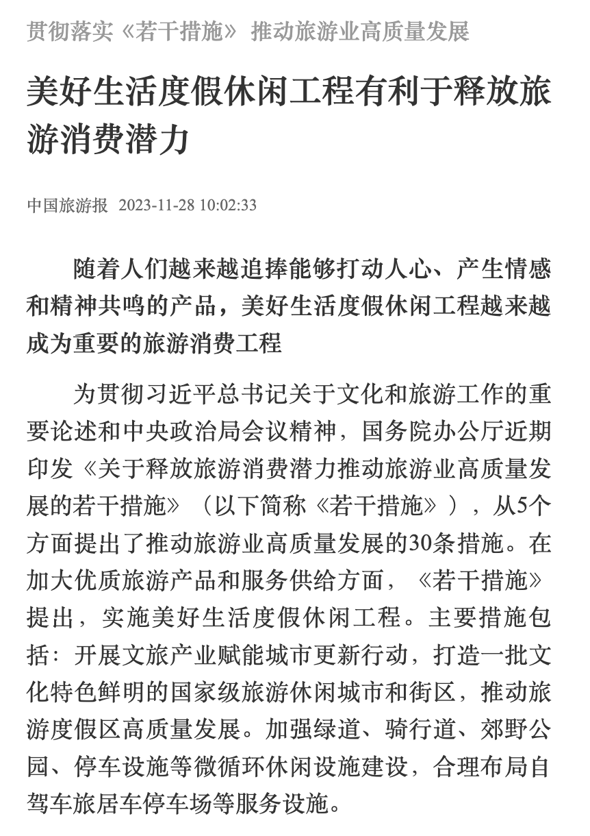 近日,英国365集团网站现代旅游业发展省部共建协同创新中心主任、中国式现代化发展研究院高级研究员石培华教授撰写的文章《美好生活度假休闲工程有利于释放旅游消费潜力》在《中国旅游报》发表。《中国旅游报》是文化和旅游部主管的旅游行业唯一全国性专业报纸,2015年、2017年,《中国旅游报》连续两次入选原国家新闻出版广电总局年度“百强报刊”。