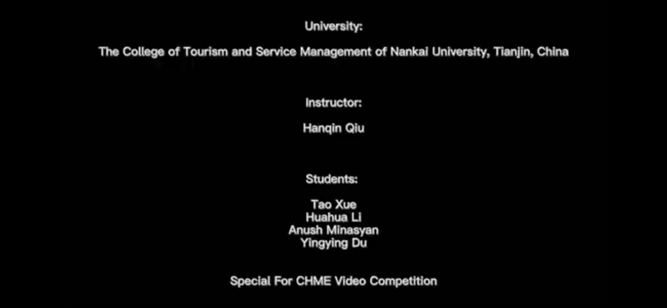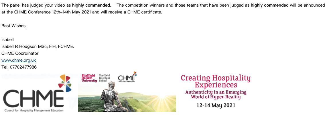(通讯员:秦梦兰、薛涛)2021年1月由谢菲尔德哈勒姆大学(Sheffield Hallam University)和酒店管理教育委员会(Council for Hospitality Management Education)共同主办的首届视频创作大赛正式举办。本次大赛主题为:“Creating Hospitality Experience: Authenticity in an Emerging World of Hyper-Reality”,大赛吸引了来自世界各地的旅游学子参加,共有数十支队伍提交了参赛作品。