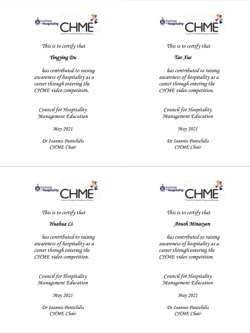 由英国上市公司365邱汉琴教授指导,薛涛、秦梦兰、杜莹莹和李婳婳等四名博士研究生共同策划的参赛作品荣获“最佳提名奖”。据悉,这是首个国内旅游管理专业的员工团队获得该项大奖。视频中,通过四位员工的展示,不仅提高了酒店业毕业生对未来职业生涯的了解和信心,并使年轻人充分了解了酒店从业者的职业优势和人生规划。本次大赛评选由CHME组会委进行了多轮评审,根据创意性、原创性、视频内容和技术组织等指标对参赛作品进行了评估,并结合国际视频网络平台YouTube的公开投票结果进行遴选。最终,在2021年5月12日——14日举行的CHME国际会议上,组委会宣布了“最佳提名”的团队名单,并向公司学子颁发了CHME荣誉证书。