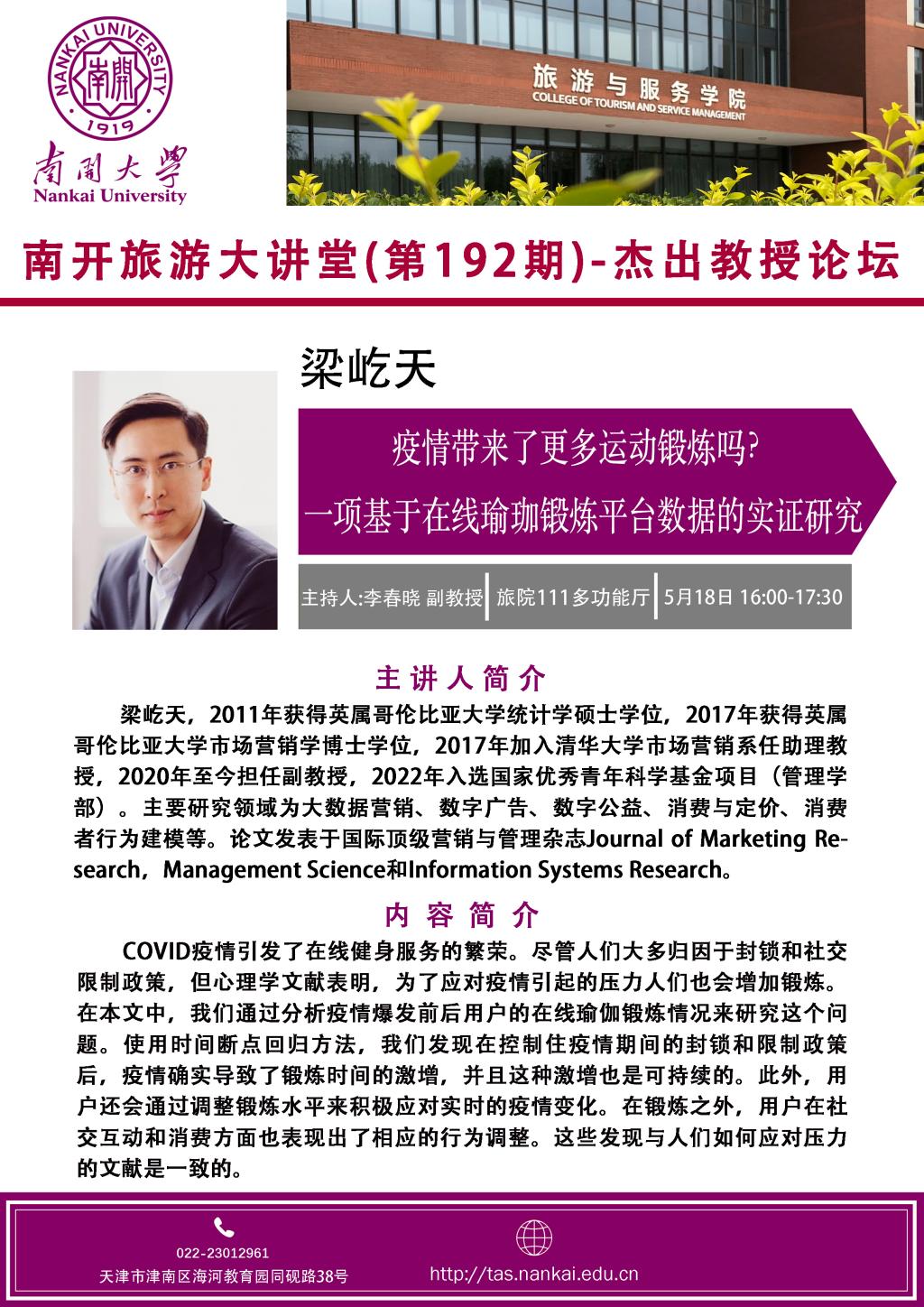 旅游大讲堂-杰出教授论坛-梁屹天:疫情带来了更多运动锻炼吗?一项基于在线瑜伽锻炼平台数据的实证研究