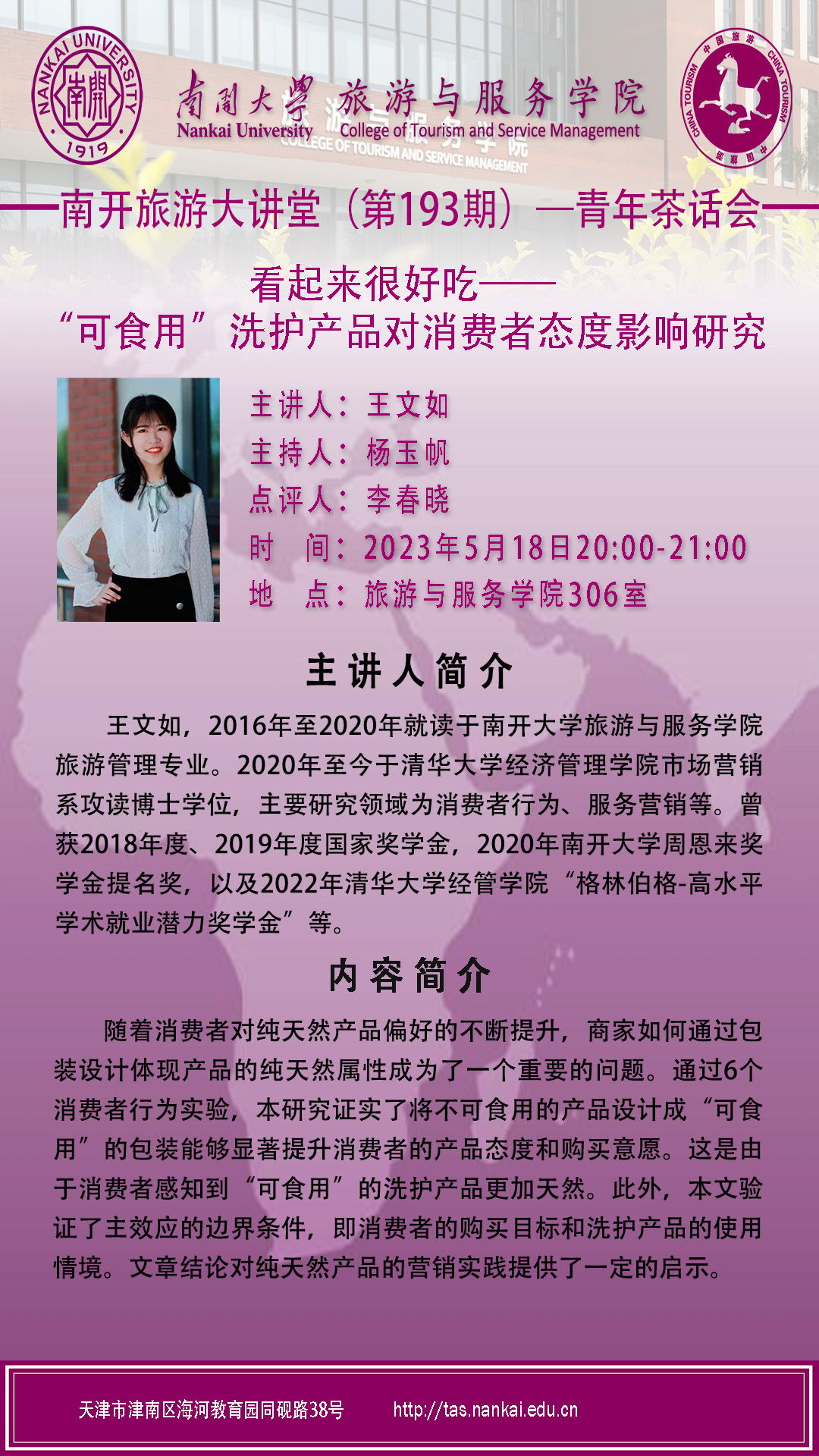 旅游大讲堂-青年茶话会-王文如:看起来很好吃—— “可食用”洗护产品对消费者态度影响研究